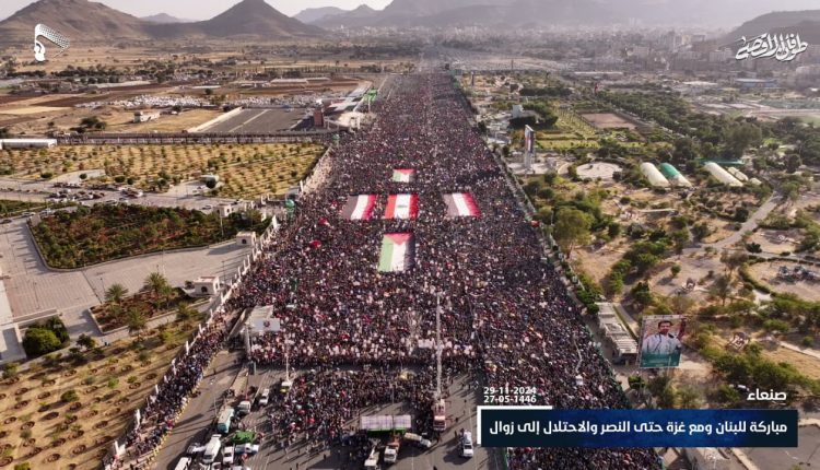 شاهد| طوفان بشري وحشود مليونية في ميدان السبعين بالعاصمة صنعاء في مسيرة “مباركة للبنان ومع غزة حتى النصر.. والاحتلال إلى زوال” (صور جوية رائعة)