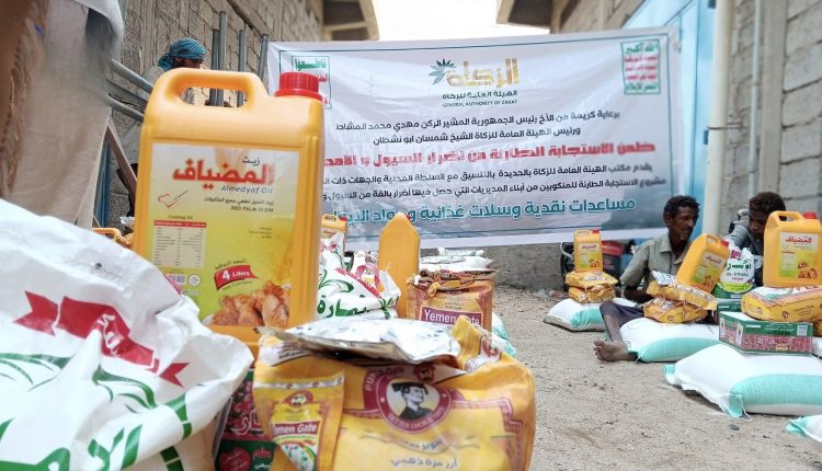 توزيع 300 سلة غذائية للأسر المتضررة من السيول في الزيدية بالحديدة